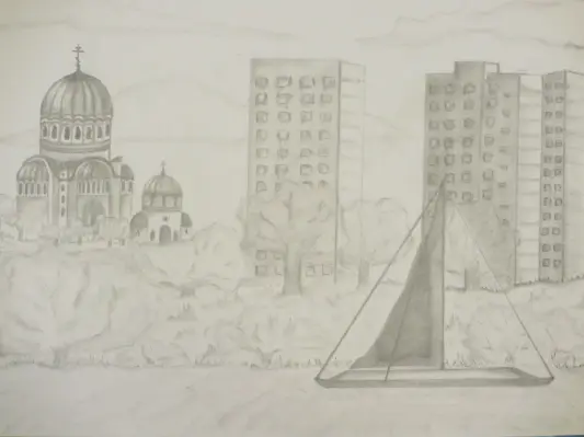 Работа выполнена графитными карандашами на бумаге ф. А3 после прогулки по улицам Москвы с родителями и младшим братом и просмотра фотографий с видами Москвы.