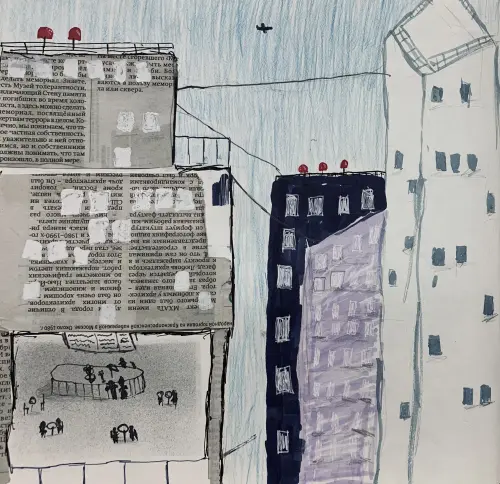 Работа выполнена маркерами, карандашами, гелиевой ручкой. Работа с элементами коллажа«Я захотел нарисовать придуманную улицу»