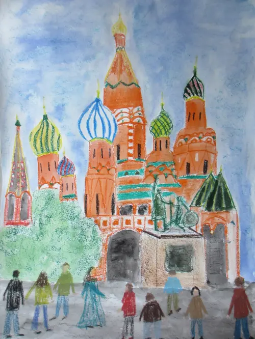 Работа выполнена по представлению после прогулки с родителями по Красной площади и просмотра фотографий. Работа выполнена на бумаге А3 красками гуашь.