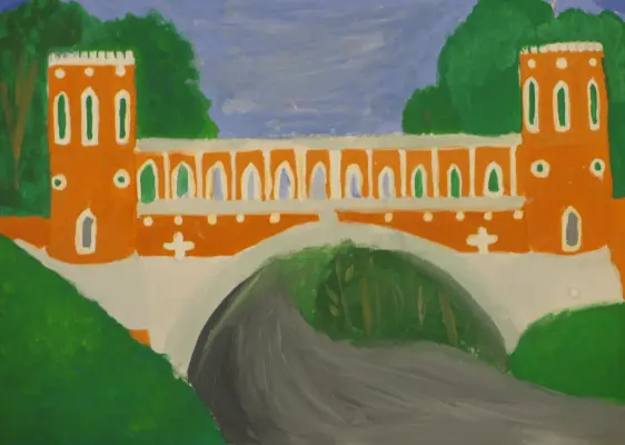 Работа выполнена после прогулки по парку Царицыно и просмотра фотографий во время прогулки вместе с родителями. Работа выполнена на бумаге А3. Краски гуашь.