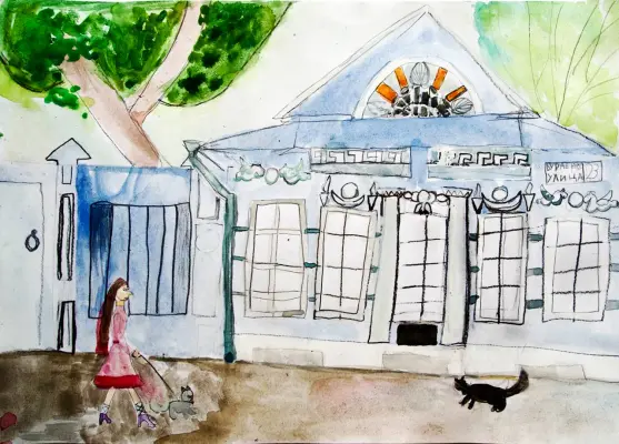 Работа была сделана с предварительного наброска и пленэрной практики по изучению знаковых архитектурных зданий и объектов Хамовнического округа. И выведена на формат А-3 для творческого исполнения и создания композиции.