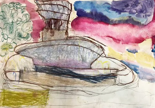 Работа была создана в рамках пленэрной практики. Автор присоединился к группе впервые. И на занятия впервые ходит целенаправленные. Здесь было рисование с натуры всех частей фонтана, и творческая работа с цветом и именно окружающим ландшафтом. Автор хотел передать воздушную среду в которой находится этот архитектурный объект.