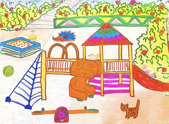 Любимая площадка Любимая площадка. Здесь здорово играть с друзьями. Когда вокруг много ярких красок, то гулять с друзьями становится веселееЛюбимая площадка. Здесь здорово играть с друзьями. Когда вокруг много ярких красок, то гулять с друзьями становится веселее. Горки, лесенки, качели это так здорово! Мы с друзьями бегаем на перегонки по нашей площадке, скатываемся с горки. Мы строим в песочнице замки. Играем в прятки.
