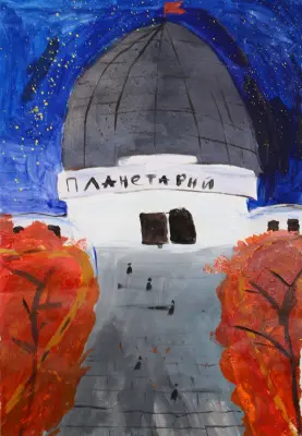 Елизавета, 8 лет: «Я решила нарисовать Планетарий, так как осталась под большим впечатлением от посещения музея вместе с родителями. Это было осенью. Здание музея имеет необычную форму, напоминающую ракету, внутри много разных помещений. Особенно мне понравился кинотеатр с огромным экраном, где показывали фильм про звезды и планеты. Казалось, что я побывала в настоящем космосе! Так же там есть интерактивный музей „Лунариум“, где все можно трогать и переключать, это очень весело и познавательно. Мне нравится посещать музеи.»