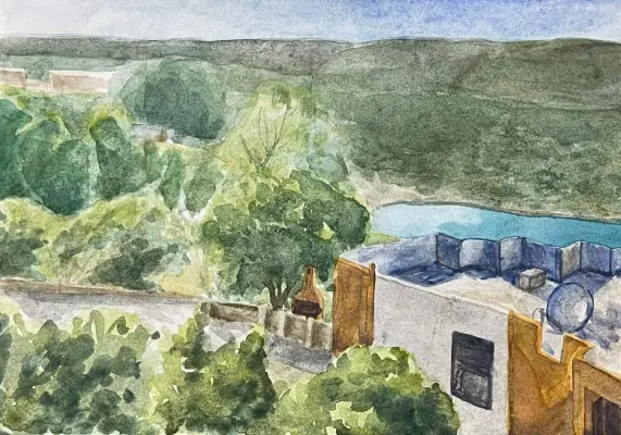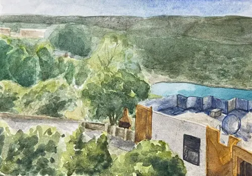 На картине изображена просто красивая улица. Нарисован магазин, дорога, речка. Солнечная погода, растут деревья, трава, кустарники. На рисунке чистое синее небо.