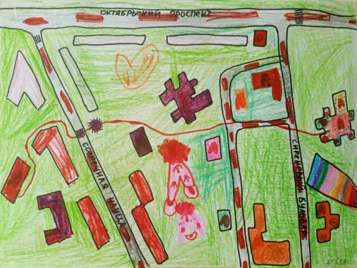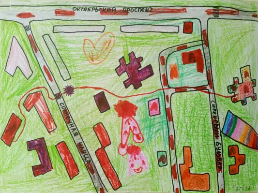 Мой любимый город- Троицк. Меня зовут Саша. В нашем городе много деревьев, домов и улиц. Я каждый день хожу в сад и нарисовал карту моего города и путь к моему любимому садику.