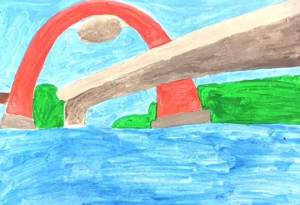 Мне нравятся красивые строения, когда я проезжала мимо этого моста, он меня поразил тем, что напомнил планету Сатурн (гостиница сверху — это планета), а свод моста его кольца.