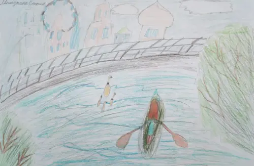 На картине изображен пруд возле Измайловкого кремля. По водной глади медленно плывет лодка, а рядом куда-то следует уточка с утятами. На втором плане изображен сам Измайловский Кремль.