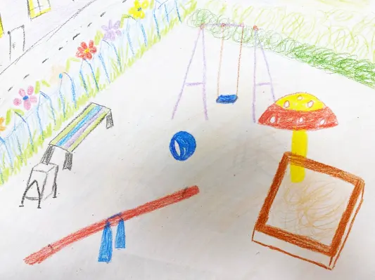 Я очень люблю гулять в своем дворе, поэтому я его и нарисовала. Рисовала я цветными карандашами. Вокруг моей площадки много цветов. Площадка летом очень красивая.