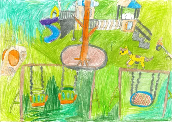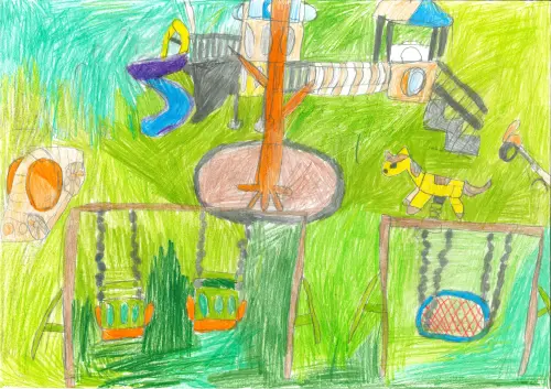 На рисунке изображена детская площадка с горками, песочницей. Так же на площадке есть качели, детская машинка и качалка и в виде лошади. Площадка в форме замка.