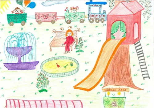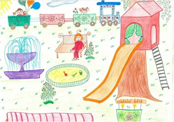 Я Лиза мне 12 лет и я не могу ходить но очень люблю рисовать это рисунок о моей любимой детской площадке куда мама меня привозит каждый день и я наблюдаю как там бегают и играют другие дети. Я очень люблю смотреть как там играет моя младшая сестрёнка, как она качается на качелях или играет на горке.