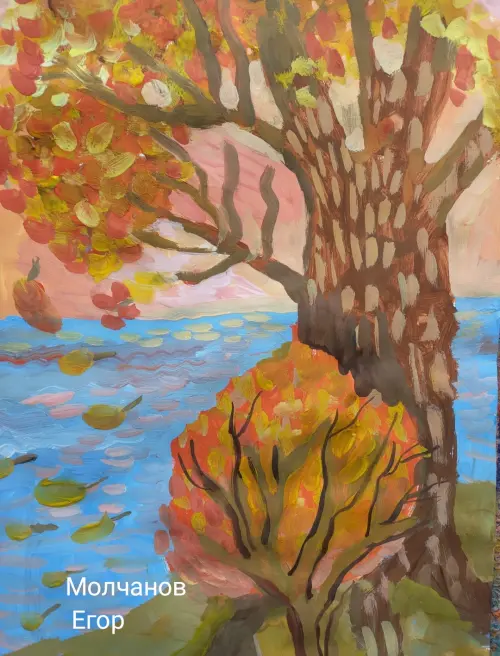 Осенний пейзаж в усадьбе Кузьминки.Рыжие деревья тихо стоят вокруг пруда.Листва медленно падает на гладь пруда.В отражении мы видим густое вечернее небо.форматА2 тех.гуашь