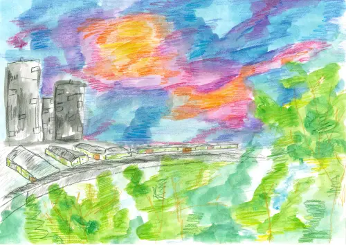 На картине изображен город. Садится солнце, стоят многоэтажные дома, Растут деревья. Изображена автомобильная дорога и рядом стоят маленькие дома. Красивый закат.