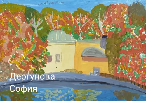 Купальня изображена со стороны водного канала, и мы видим ее отражение в воде.