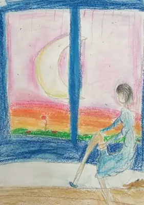 На рисунке изображена девочка, сидящая на уютном подоконнике и задумчиво глядящая в окно. За стеклом простирается изумительный вид: ночное небо, усыпанное яркими звездами, и великолепная луна, берущая центральное место на фоне темного небосвода.