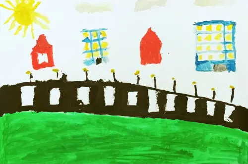 Дорога и новостройки. Дома освещены солнцем, Москва растет, строятся все новые и новые дома. Город преображается и становится всё больше: улучшают парки и скверы. Появилось много развилок и новых дорог.