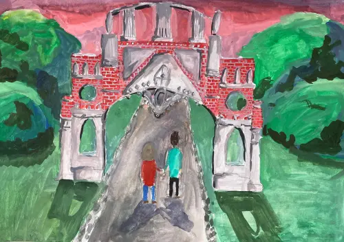 Я часто гуляю с родителями в парке Царицыно. Это очень красивое и живописное место. Всегда беру с собой блокнот и карандаш, чтобы запечатлеть достопримечательности. Особенно мне понравились Фигурные ворота.Работа выполнена на формате А3, гуашь.