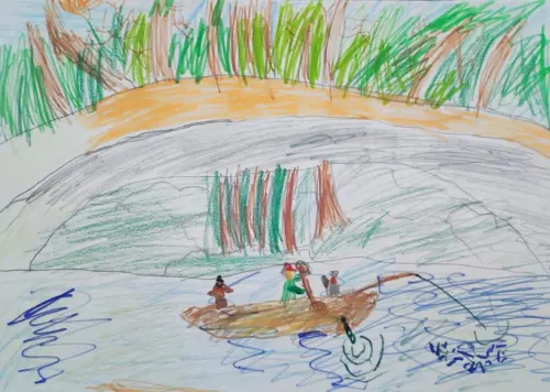 На картине изображен Лебедянский пруд в Измайловском парке с мирно плывущей лодочкой, в которой находятся собака и рыбак.