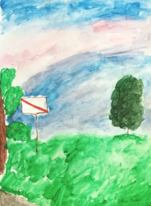 В этом месте купаться запрещено, потому что рядом что то опасное, а может просто так табличку поставили. Люди сюда приходят просто отдохнуть в тени деревьев, но как и полагается — никто в воду не заходит.