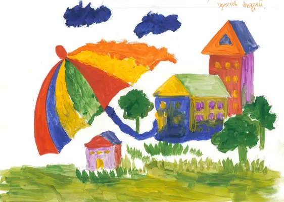 Я нарисовал домики нашего двора, домик-мама и домик-папа, которые защищают маленького домика-сына от дождика, у нас много больших домов и много маленьких и мне всегда кажется, что есть дома-папы и домики-мамы, а рядом с ними домики-дети.