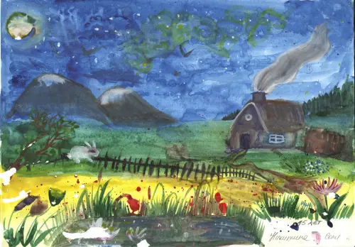 Я нарисовала то, как я вижу один из старых домов в нашем районе, в котором топилась печка, разводились домашние животные, можно было половить рыбу в речке.