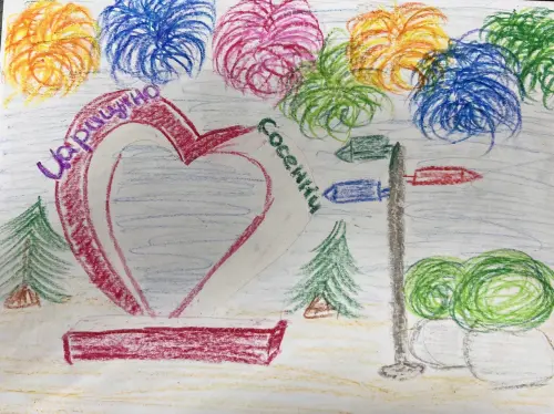 Я нарисовал рисунок под названием «Сосенки в будущем», потому что очень бы хотелось в будущем поставить такое красивое сердце именно в парке «Сосенки» в районе Царицыно, там много отдыхающих и я там постоянно гуляю. Я очень люблю парк «Сосенки»!