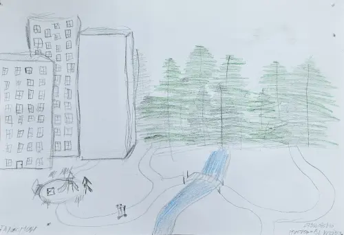 Вид из моего окна, я считаю, замечательный. Ручеёк вытекает из густого леса, в котором люблю кататься на велосипеде. Также есть детская площадка, где любят играть дети.