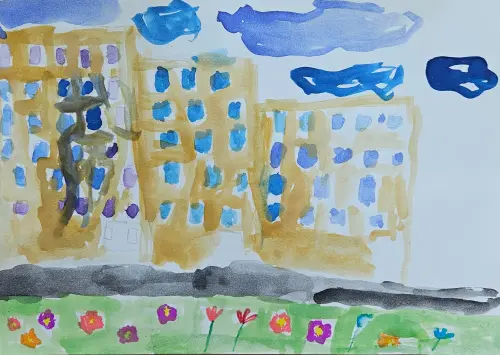 Мы с ребятами сегодня делали рисунки своих районов и дворов. Я нарисовала свой любимый цветной дом. Рядом с домом есть клумба где растут красивые цветочки.