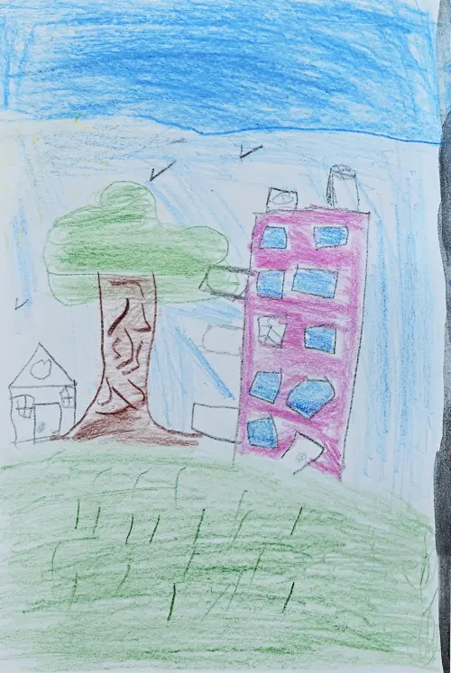 Сегодня мы с ребятами делали рисунки своих дворов и районов. Я живу в седьмом микрорайоне. У меня во дворе видно детскую площадку, на которой я провожу время.