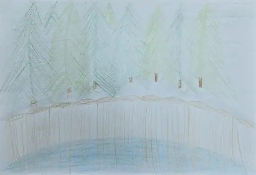 Сегодня мы с ребятами делали рисунки своих дворов и районов. Я живу в первом микрорайоне и часто гуляю в лесу, где живут белки с ёжиками.