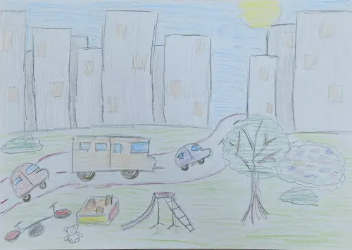 Сегодня мы с ребятами делали рисунки своих дворов и районов. Я живу в четыреадцатом микрорайоне, часто гуляю по нему