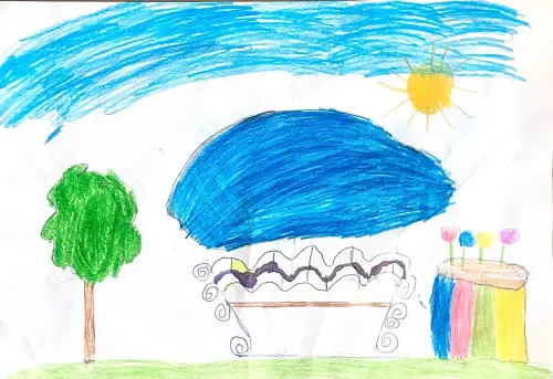 Я нарисовала свой район, у нас очень красиво, озеро рядом, парк, деревья, скамейку нарисовала и цветы. Нам очень нравится наш район, мы каждый вечер гуляем с родителями
