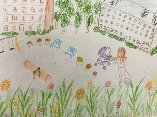 Я выполнила рисунок цветными карандашами. Мой двор очень красивый. На рисунке я постаралась изобразить его. Много зелени и цветов. Дома у нас новые высокие. Летом особенно наш двор красив.