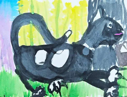Сегодня мы с ребятами делали рисунки своих дворов и районов. Я живу в одном доме с кошкой по кличке Муся. Муся кошка полудомашняя, гуляет где хочет, но кушает только у нас дома.