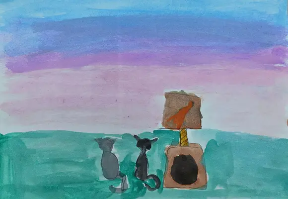 Сегодня мы с ребятами делали рисунки своих дворов и районов. Я живу в первом микрорайоне. У меня во дворе живут котики, которых мы с мамой подкармливаем, поэтому они уже как члены нашей семьи.