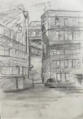 Моя работа выполнена графическим карандашом.На ней изображены дома старые.Они очень отличаются от современных, но в них есть необычная красота.Мы с моей сестрой очень любим рисовать, особенно старые здания.