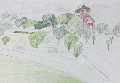Моя работа представляет собой вид на церковную горку, которая находиться около метро вднх 4 и 5 выход. На рисунке изображена аллея и Тихвинская церковь.