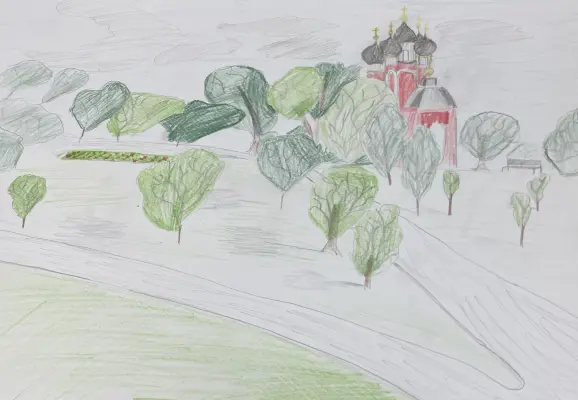 Моя работа представляет собой вид на церковную горку, которая находиться около метро вднх 4 и 5 выход. На рисунке изображена аллея и Тихвинская церковь