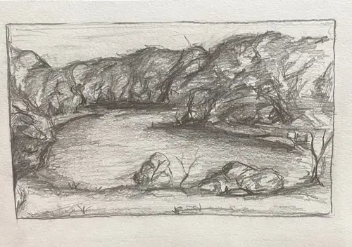 Моя работа выполнена графическим карандашом.Я люблю рисовать природу.Мой район озеленен и есть парк Люблино, в котором и есть такой красивый пруд.Я его постарался изобразить как можно точнее.