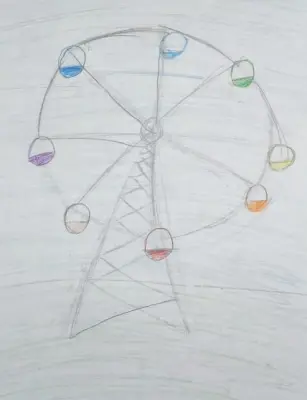 На картине изображено колесо обозрения, находящееся на территории Измайловского Кремля, в летнее время года.