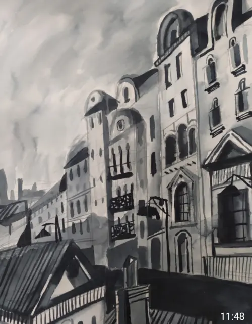 Летняя практика.Зарисовки с натуры на заданную тему " Мой район".Пленэр.Вид старого города, фасады домов в перспективе.Техника исполнения смешанная: тушь, бумага, акварель, перо.ФорматаА 3.