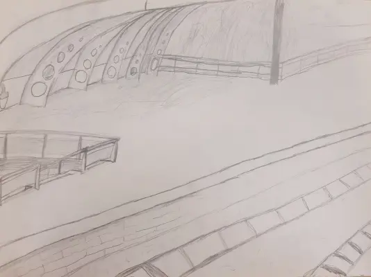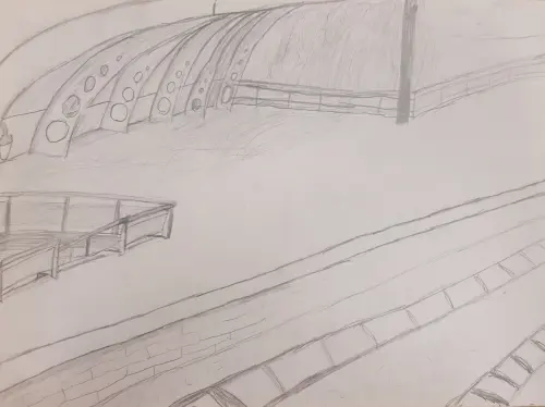 Я изобразил железнодорожную станцию Маленковская в черно-белом окрасе. За ней виднеется парк Сокольники. Каждый день по ней множество людей ездит на работу и загород.