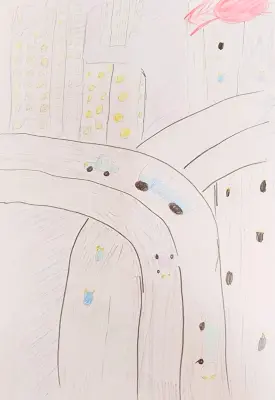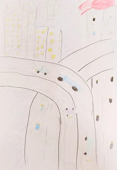 Мы живем на 21 этаже, поэтому свой двор я не вижу, он внизу. Зато мне видно, как едут по эстакадам машины, совсем крохотные, как букашки. Видно высотные дома.