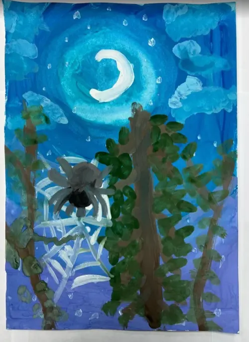Темная ночь в Терлецком парке. Паук на дереве в свете полумесяца.