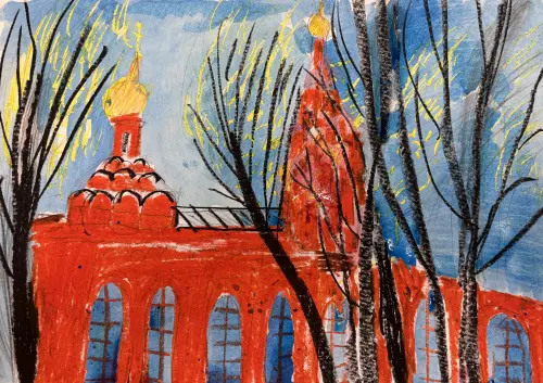 На этом рисунке изображен храм я вдохновился этим храмом, он красного цвета с золотыми куполами мне запомнился храм из за того что возле него были деревья с желтыми листочками