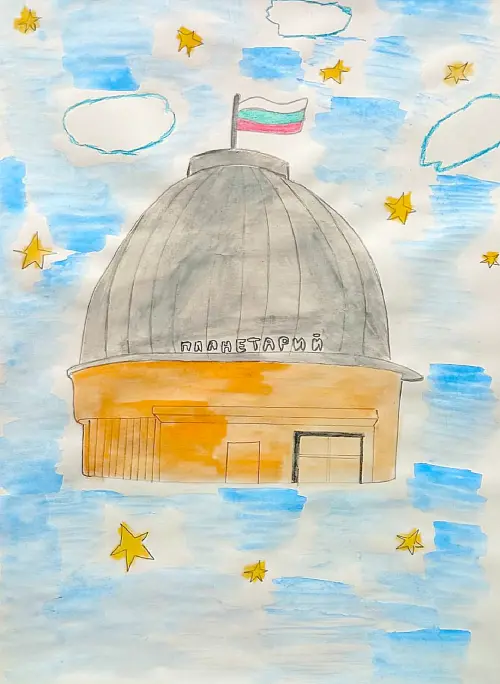 Я очень люблю свой город. Я родился в Москве. Был недавно с папой в Планетарии. Он находится недалеко от Московского зоопарка. Мне очень понравилось. Я вообще люблю все о космосе и звездах. И решил потом нарисовать эту работу. Рисовал красками и фломастерами. Рисовал долго. Целых два дня.
