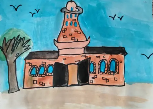 Я нарисовала пожарное отделение номер 12. Мы ходили туда на экскурсию. Оно очень старое, ещё дореволюционной постройки. Работу я выполнила акварелью.