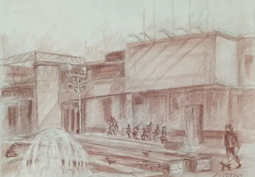 Здесь никогда не бывает пусто. Кто-то гуляет, любуется фонтаном. А летом здесь проходит пленэр учеников художественной школы. Это место известно каждому жителю нашего городка и нам это место очень дорого. И я не исключение.На моей работе я изобразила книжный магазин. Пожалуй, единственный подобный магазин на весь наш небольшой городок. Перед ним находится большой фонтан, знаменующий начало Сиреневого бульвара — центра всей культурно-общественной жизни нашего города.