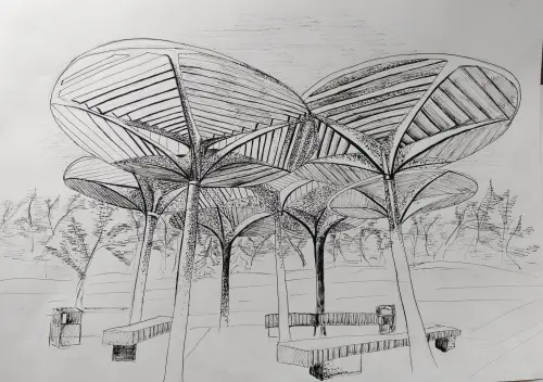 Рисунок «Грибная полянка» выполнен линером графической техникой. На рисунке изображена зона отдыха в парке г. Москвы п. Михайлово-Ярцевское, пос. Шишкин Лес.