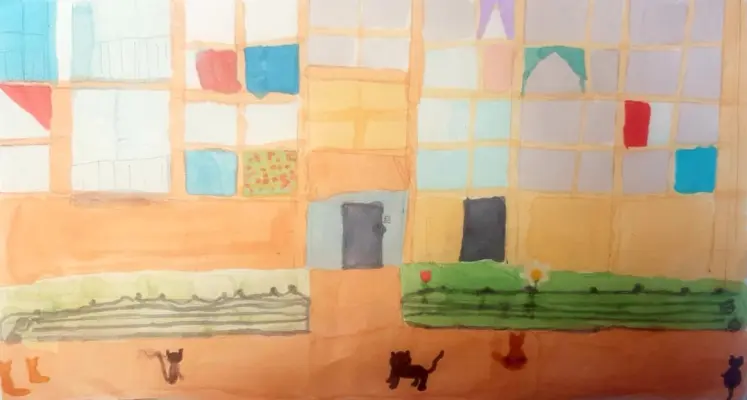 Я живу в очень красивом дворе, много цветов, кустов и деревьев. У нас во дворе живут кошки. Мы их любим, кормим. Собаки их не обижают. В нашем дворе есть качели.
